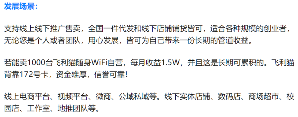 172 号卡倾心打造飞利猫综合管理平台,直击随身 WiFi 千亿市场,首创线上线下融合模式,打通电商、实体全链路。加盟即享一级政策,按套餐长期分润高达 60%,客户充值就有收益进账,真正的管道收益!